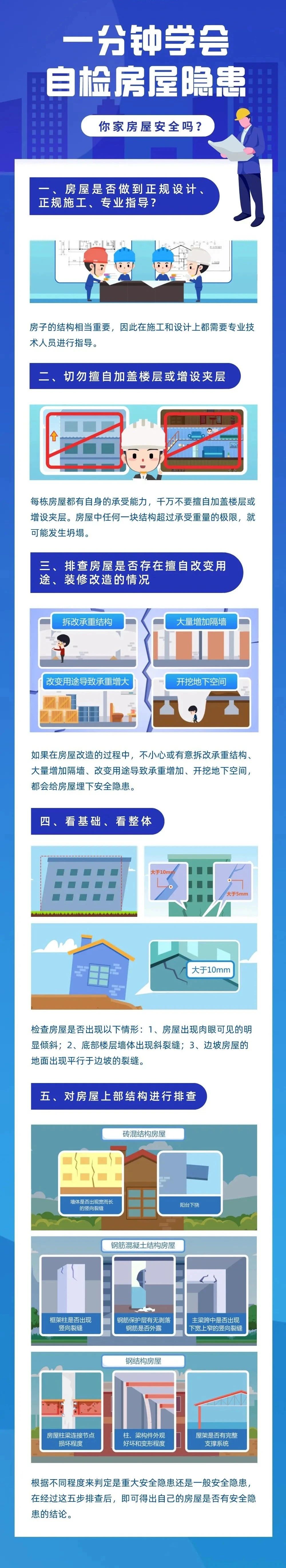 房屋是日常生產生活的重要場所,房屋安全與大家生活品質息息相關。房屋像人一樣,會經歷“生、老、病、死”,從出生到死亡,有病要治病,沒病要體檢。平時會出現一些“病害”,如果沒有及時發現、早日醫治,慢慢會演變成傾斜、折斷、坍塌等“重癥”乃至“死亡”。關于房屋安全,這些知識您要及早了解。